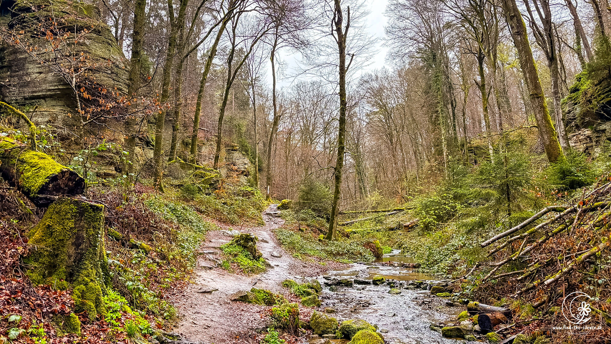 Maxi wartet schon ungeduldig auf unser nächstes Abenteuer, einen gemeinsamen Spaziergang durch das malerische Haupeschbaachtal. Die Burg Beaufort liegt direkt am Müllerthal Trail 3 und bietet sich somit als perfekter Ausgangspunkt für zwei reizvolle Retouren in wunderschöne Bachtäler an. Die Strecke entlang des Haupeschbaach nach Norden erscheint mir auf der Karte idyllischer und entspannter, und so entscheide ich mich für den Weg in Richtung Süden, vorbei an einem kleinen See. Nach einer kurzen, gemächlichen Strecke wird es schnell wieder wildromantisch: Auf der einen Seite rauscht der kleine Bach, auf der anderen Seite erheben sich beeindruckende Felsen mit kleinen Höhlen. Dazwischen laden immer wieder idyllische Bänkchen zu einer Pause ein, und die Wegabschnitte sind abwechslungsreich und naturbelassen. Wie so oft im Müllerthal geht es auf und ab, und wir nähern uns langsam, aber sicher dem Bach immer weiter an. Nachdem wir einige malerische Brücken überquert haben, beginnt es leider wieder stärker zu regnen, und wir beschließen, doch wieder umzukehren. Dennoch war es eine wunderschöne Strecke, herrlich ruhig und einsam, eingebettet in eine gigantische Natur. Beaufort zeigt sich hier von seiner grünen Seite.
