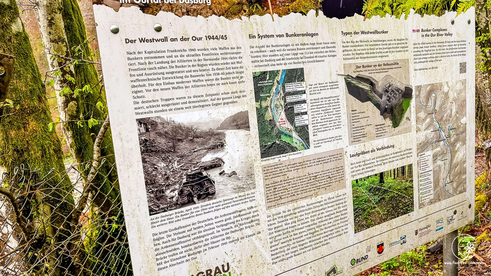 Der Bunkerwanderweg bei Dasburg thematisiert die Überreste des Westwalls, der entlang der Our verlief. Entlang des Weges sind Bunkerruinen und Informationstafeln zu finden, die die Geschichte dieser Verteidigungsanlage und die Ereignisse des Zweiten Weltkriegs in dieser Grenzregion erläutern. Der Weg verbindet auf interessante Weise Naturerlebnisse mit der Auseinandersetzung mit der Vergangenheit.