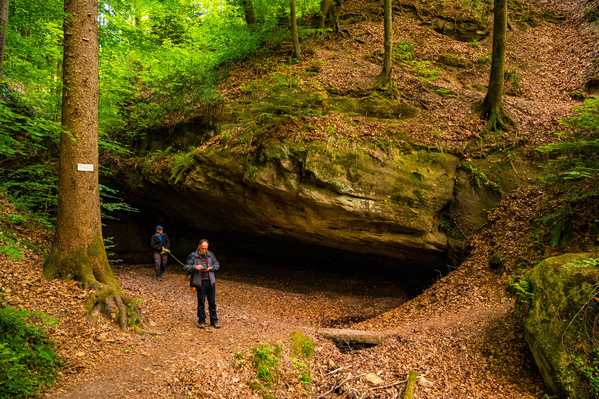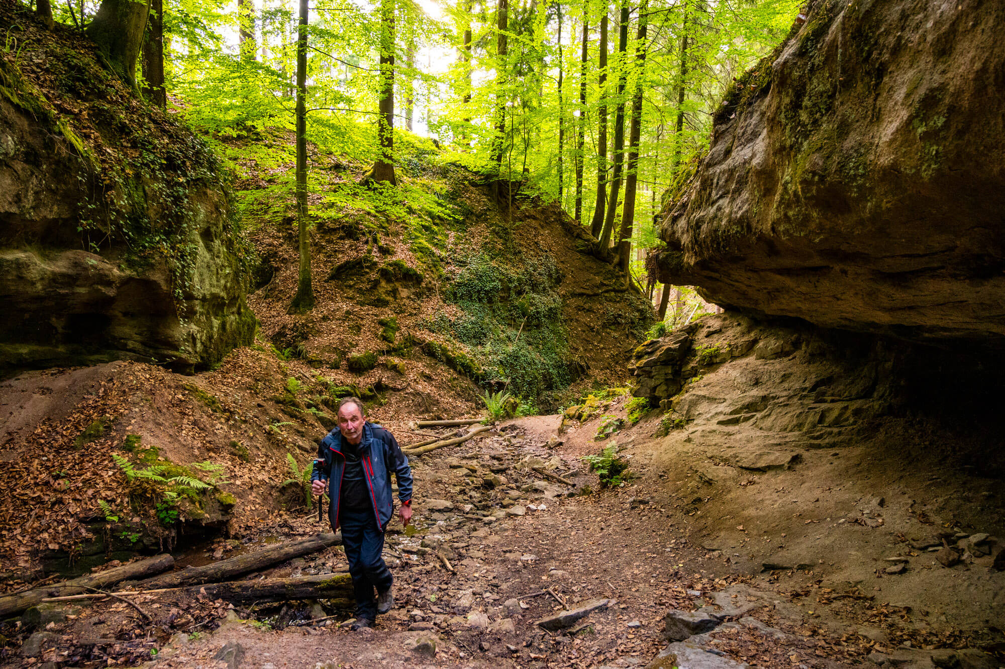 Nachdem die Wohnmobile eingerichtet waren und der erste Kaffee getrunken war, zog es uns nach draußen. Für den Samstagnachmittag hatten wir uns eine kleine Wanderung bei Wüstenrot ausgesucht. Auf der Landkarte sahen die eingezeichneten Schluchten vielversprechend aus, aber ganz überzeugt, ob die Tour wirklich toll wird, waren wir ehrlich gesagt nicht. Die Skepsis verflog allerdings schon nach wenigen Metern! Der Weg führte uns auf einem wunderschönen kleinen Pfad herrlich hinein in eine erste kleine Schlucht (der Bodenbachschlucht). Das Wasser plätscherte leise neben uns, überall gab es die typischen roten Sandsteinfelsen zu sehen, und die Atmosphäre war herrlich einsam und ruhig. Ein wunderschöner Wald umgab uns. Wir folgten der Schlucht hinab ins Tal und nahmen dann links den Weg, der uns eigentlich nur wieder nach oben bringen sollte. Auch hier waren wir, ehrlich gesagt, wenig optimistisch. Umso größer war die Überraschung, als uns der Weg in die Tobelschlucht führte – eine weitere wunderschöne Schlucht mit einem rauschenden kleinen Wasserfall, wunderbaren Felsen und… ordentlich Treppenstufen bergauf! Am Ende wartete der Hohe Stein, eine tolle kleine Halbhöhle, ein beeindruckendes Naturdenkmal und ein wirklich schöner Ort zum Verschnaufen. So wurde diese kleine Wanderung zu einem unerwartet schönen Erlebnis im Rahmen unseres Wohnmobil Wochenende im Schwäbischen Wald. Maxi war von den vielen Gerüchen und dem Klettern sichtlich begeistert.