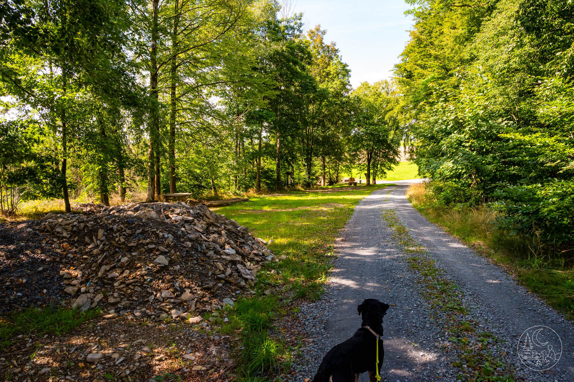 Der große Wanderparkplatz von Lauenstein liegt friedlich in der Morgensonne, leer und still. Kein Auto weit und breit – obwohl es Sommer ist, obwohl es schon nach neun ist, obwohl es hier so unfassbar schön ist. Maxi schaut mich an, als hätte er das Ganze extra organisiert. Wir starten am Dachsbach, folgen dem Wetzsteinmacherweg, der uns gleich ordentlich bergauf schickt. Nach wenigen Minuten bin ich gut durchgelüftet, Maxi hingegen tänzelt federleicht voraus, schnüffelt an Wurzeln, grinst mir zu. Immer wieder erspähen wir bunte Tafeln mit Märchenmotiven – die perfekte Ausrede für Pausen, bei denen ich den Puls wieder in den zivilisierten Bereich bringe. Besonders schön: Zwischen den Schildern stehen Bänke, kleine Rastplätze oder einfach umgestürzte Bäume, die zu einer Pause einladen. Die Sonne bricht durch das Blätterdach, und für einen Moment ist alles ruhig – nur das leise Plätschern des Bachs und Maxis trappelnde Pfoten. Ich habe das Gefühl, dass selbst der Wald noch schläft und erst langsam zu sich kommt.