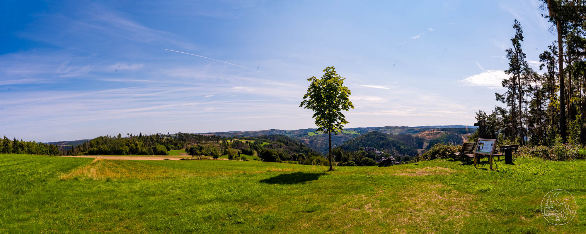 Ein kurzer, aber steiler Straßenabschnitt bringt uns zum kleinen Parkplatz unterhalb der Thüringer Warte. Von hier geht’s ein paar Meter zu Fuß zum Aussichtsturm – und wir haben ihn, wie so ziemlich alles heute, für uns allein. Der Turm aus Metall und Wellblech wirkt auf den ersten Blick eher funktional als schön, aber oben wartet ein herrlicher Blick über den Frankenwald, bis hinein ins Thüringer Schiefergebirge. Da mir bei der Konstruktion etwas mulmig wird, schicke ich die Drohne hoch – Maxi wartet unten, als hätte er gewusst, dass ich kneife.