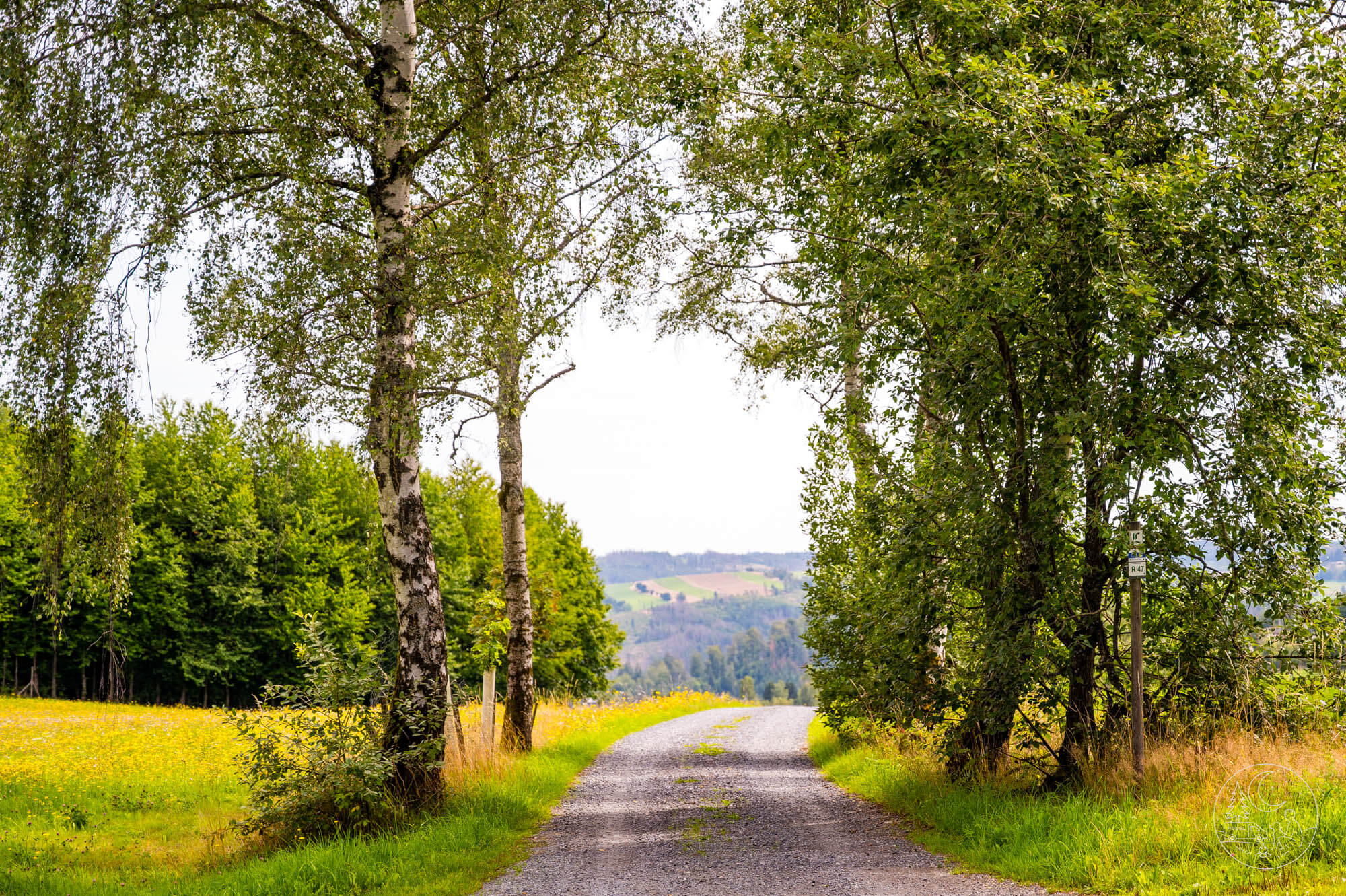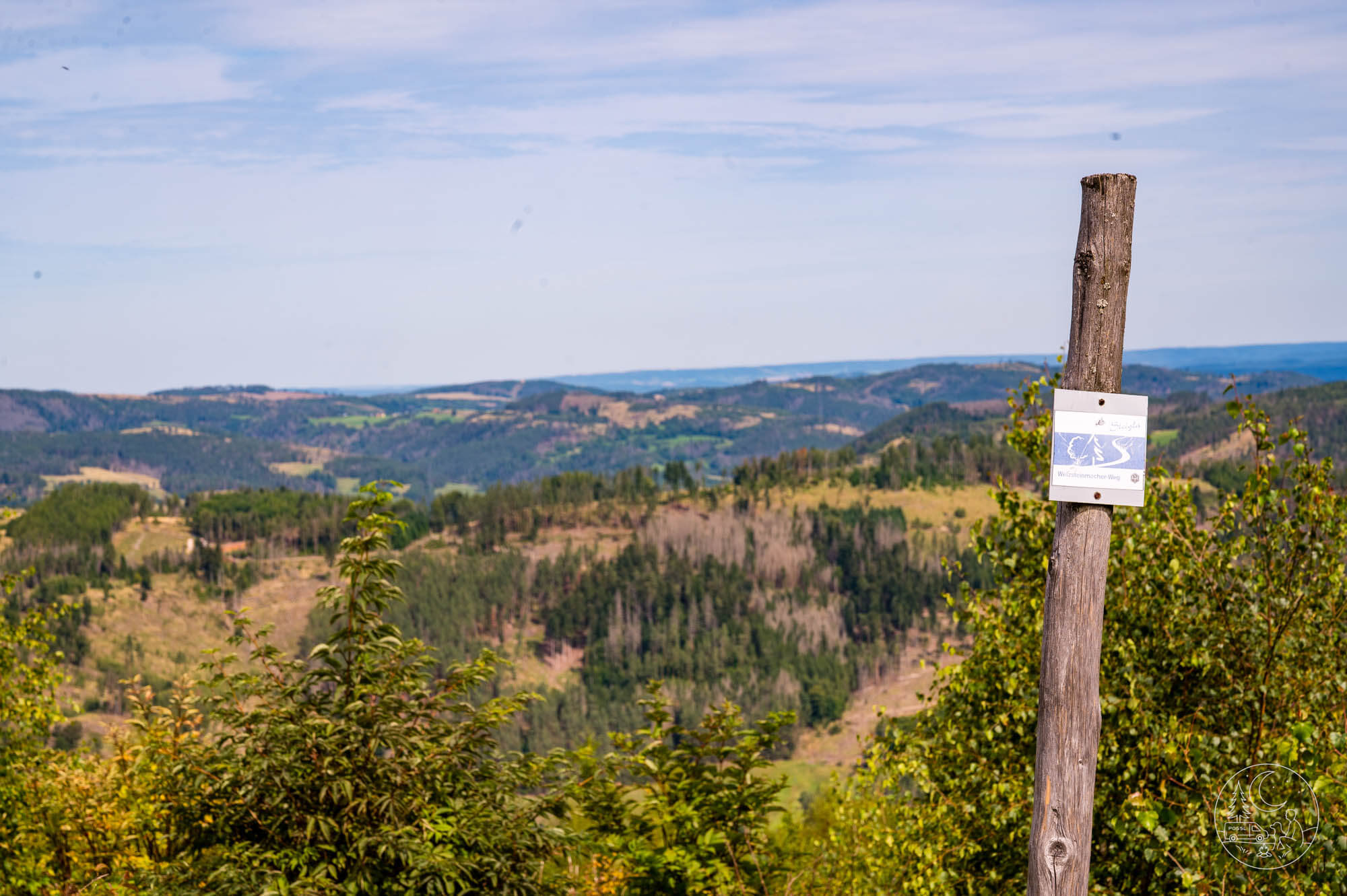 Lauenstein ist kein Ort, an dem man einfach „mal eben“ spazieren geht. Wer hier losläuft, hat Auswahl: Der Wetzsteinmacherweg, benannt nach einem alten Handwerk, führt in einem Rundkurs durch schattige Wälder und vorbei an Relikten vergangener Zeiten. Der Märchenpfad richtet sich mit liebevoll geschnitzten Figuren an große und kleine Kinder, der Schieferpfad informiert über die Geologie der Region und das Grüne Band – einst tödlicher Grenzstreifen – verbindet Natur und Geschichte in einzigartiger Weise. Und weil uns die Auswahl zu langweilig war, haben Maxi und ich einfach alles kombiniert – ein bisschen Frankenwald-Wanderbaukasten, ganz nach unserem Geschmack. Die Wege sind wunderbar ausgeschildert, gepflegt und abwechslungsreich – mal breite Forstwege, mal wurzelige Waldpfade, dann wieder luftige Höhenrücken mit Fernblick. Jeder Abschnitt hat seinen eigenen Charakter, und genau das macht das Wandern hier so reizvoll.