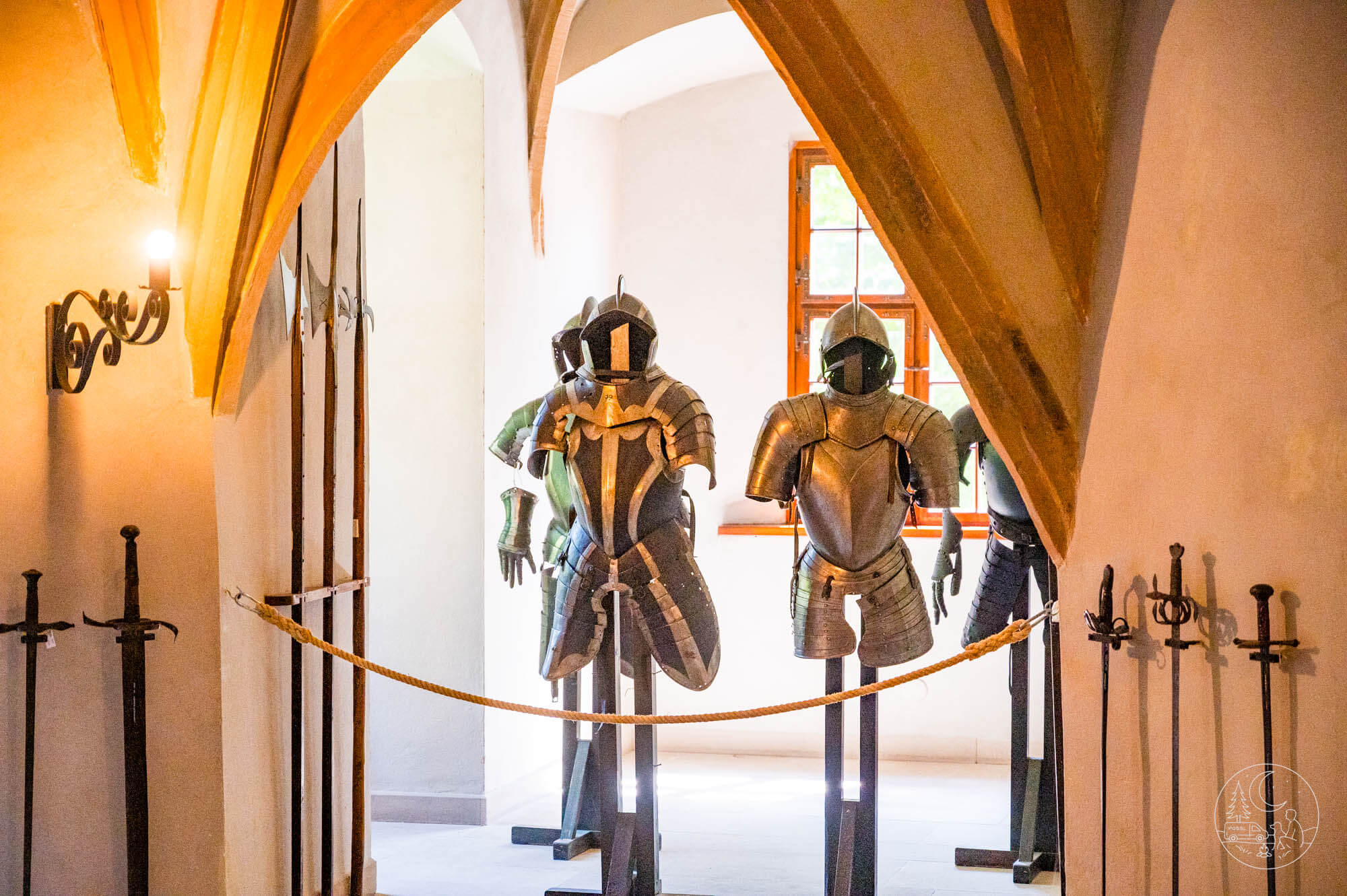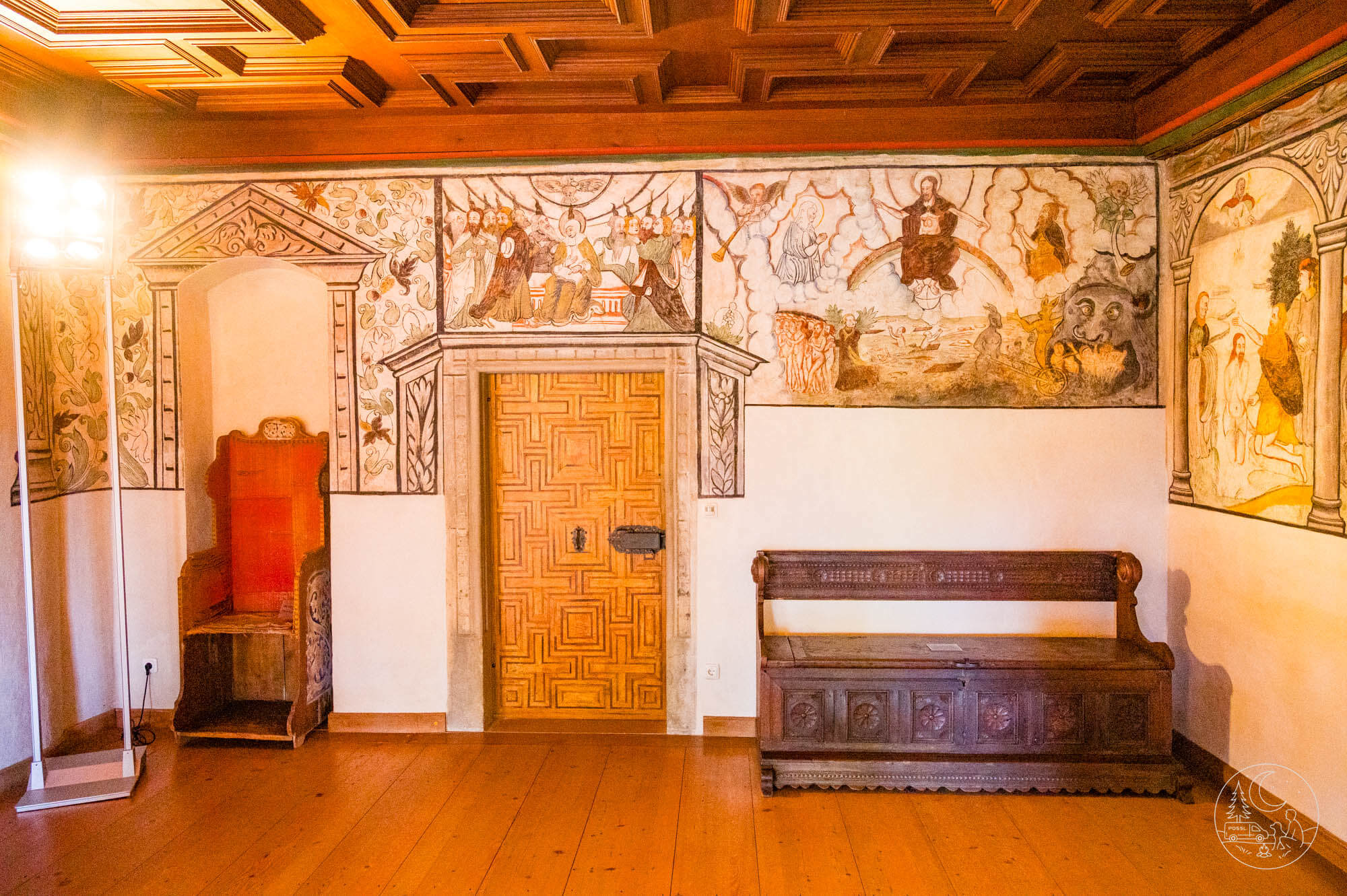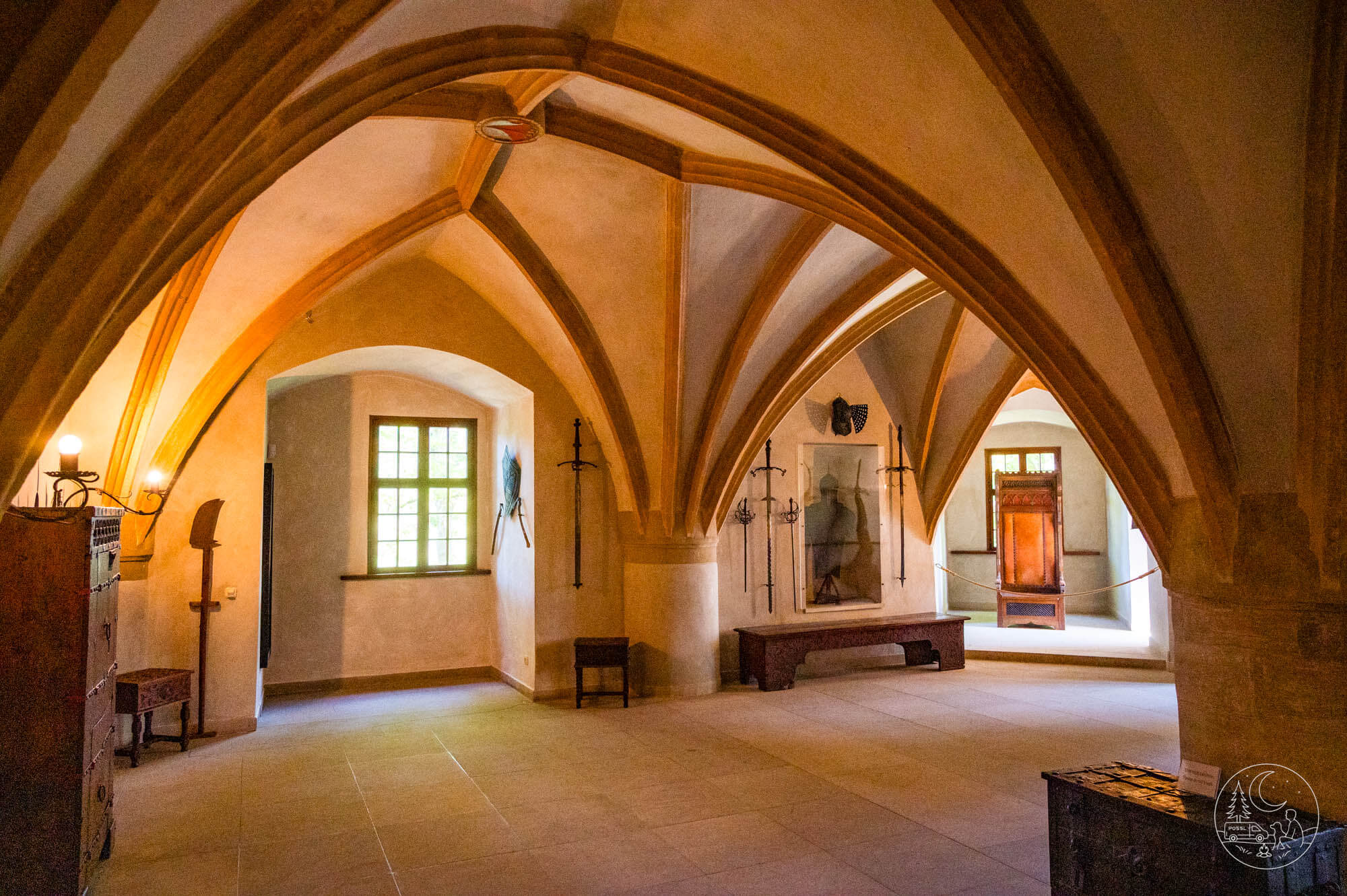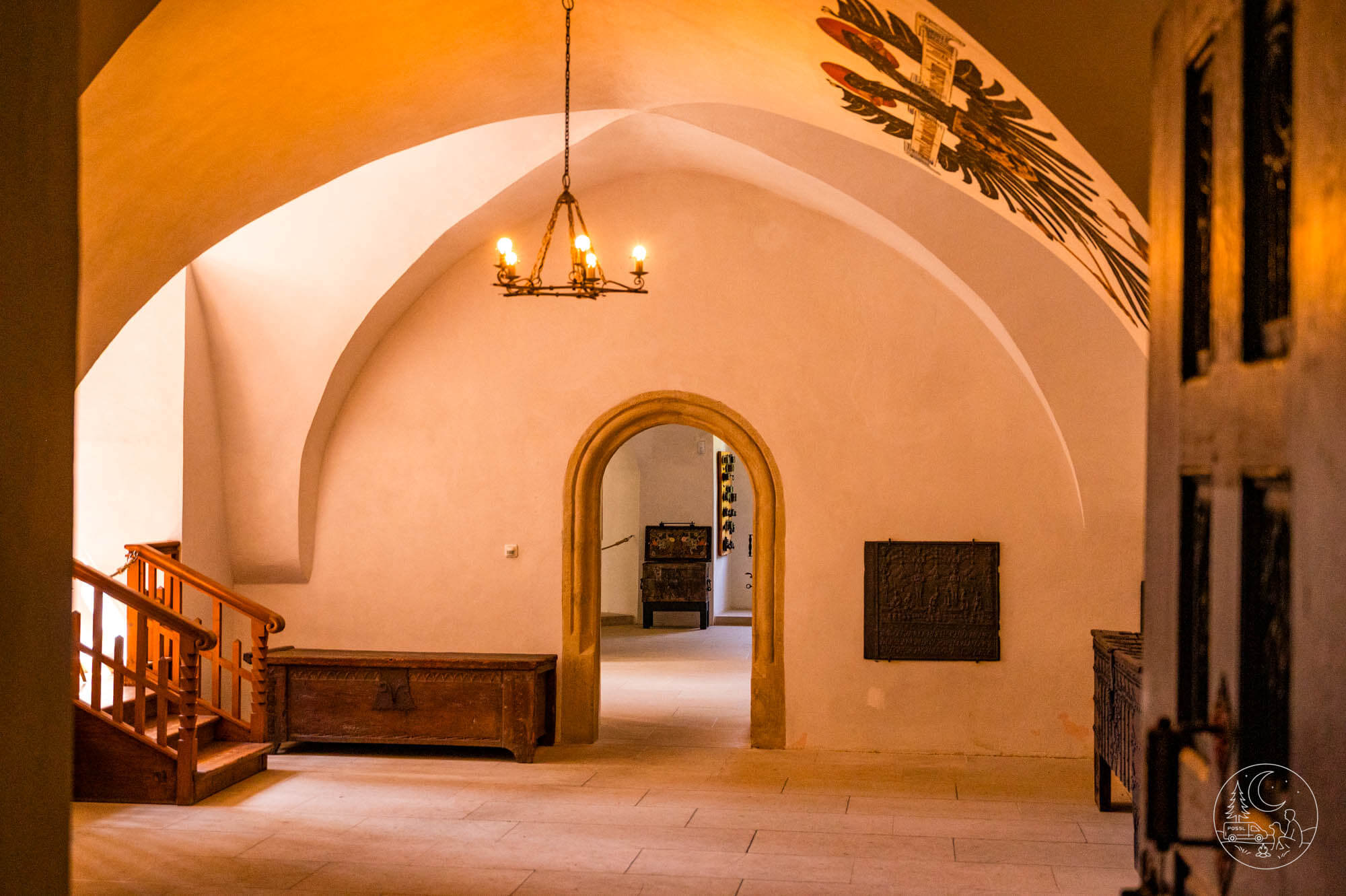 Wieder am Wohnmobil angekommen, streckt sich Maxi zufrieden auf die Matte, während ich zur Burg Lauenstein aufbreche. Der Zugang ist momentan wegen Bauarbeiten etwas umständlich – gut ausgeschildert, aber mit Umleitung. Oben angekommen, öffnet sich ein weiter Innenhof. Die Burg kann nur mit Führung besichtigt werden – und ich komme leider zehn Minuten zu spät. Aber: Als die 40 Minuten um sind, ist außer mir niemand gekommen. Und so startet meine 45-minütige Privatführung – für 4,50 €! Wir spazieren durch herrlich erhaltene Räume, voller Möbel aus verschiedenen Jahrhunderten. In einem Raum wird mir ein Geheimgang gezeigt – eine alte Wendeltreppe, die einst ins Tal führte. Leider heute verschlossen, aber die Vorstellung allein lässt das Kopfkino anspringen.