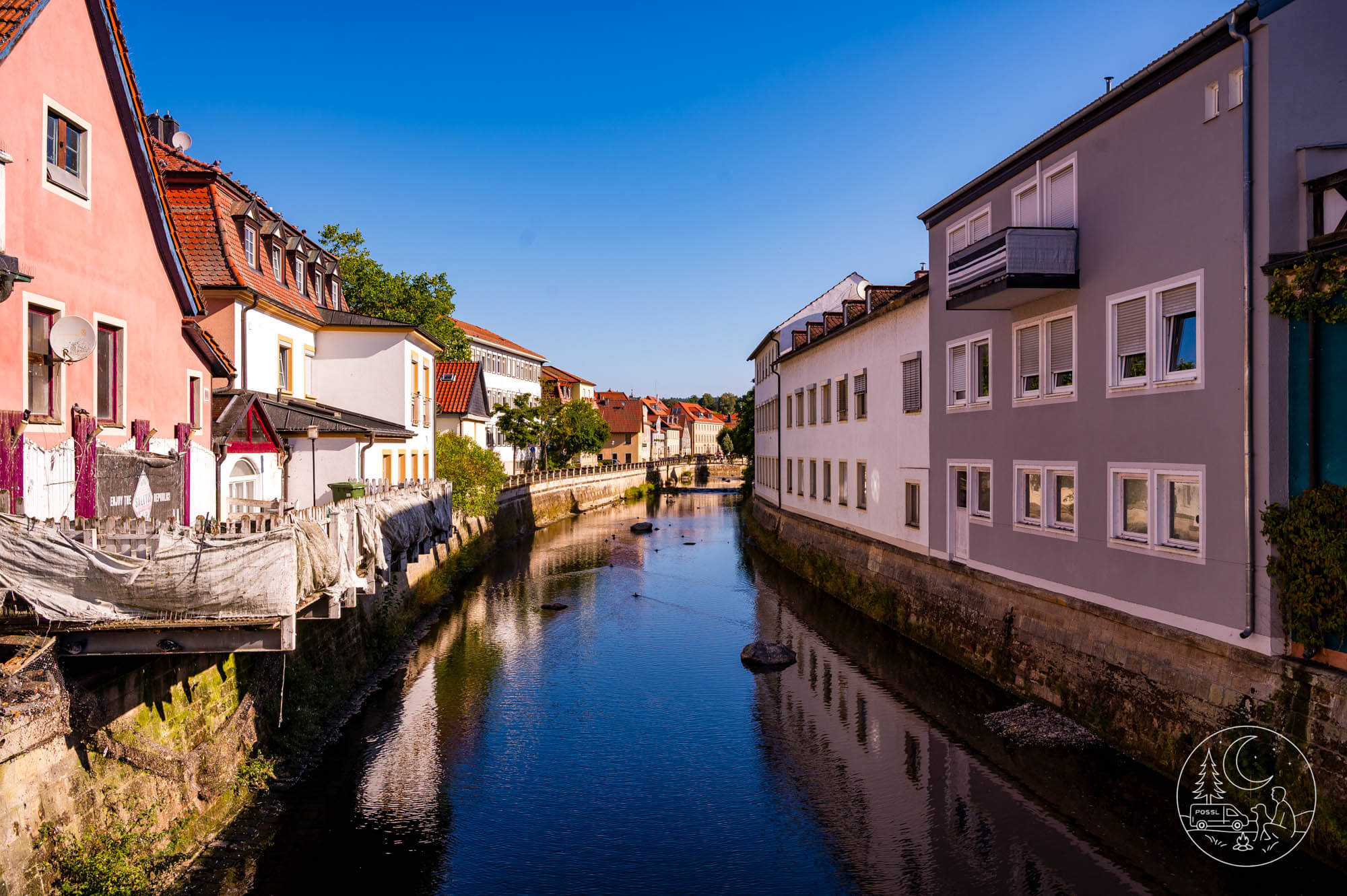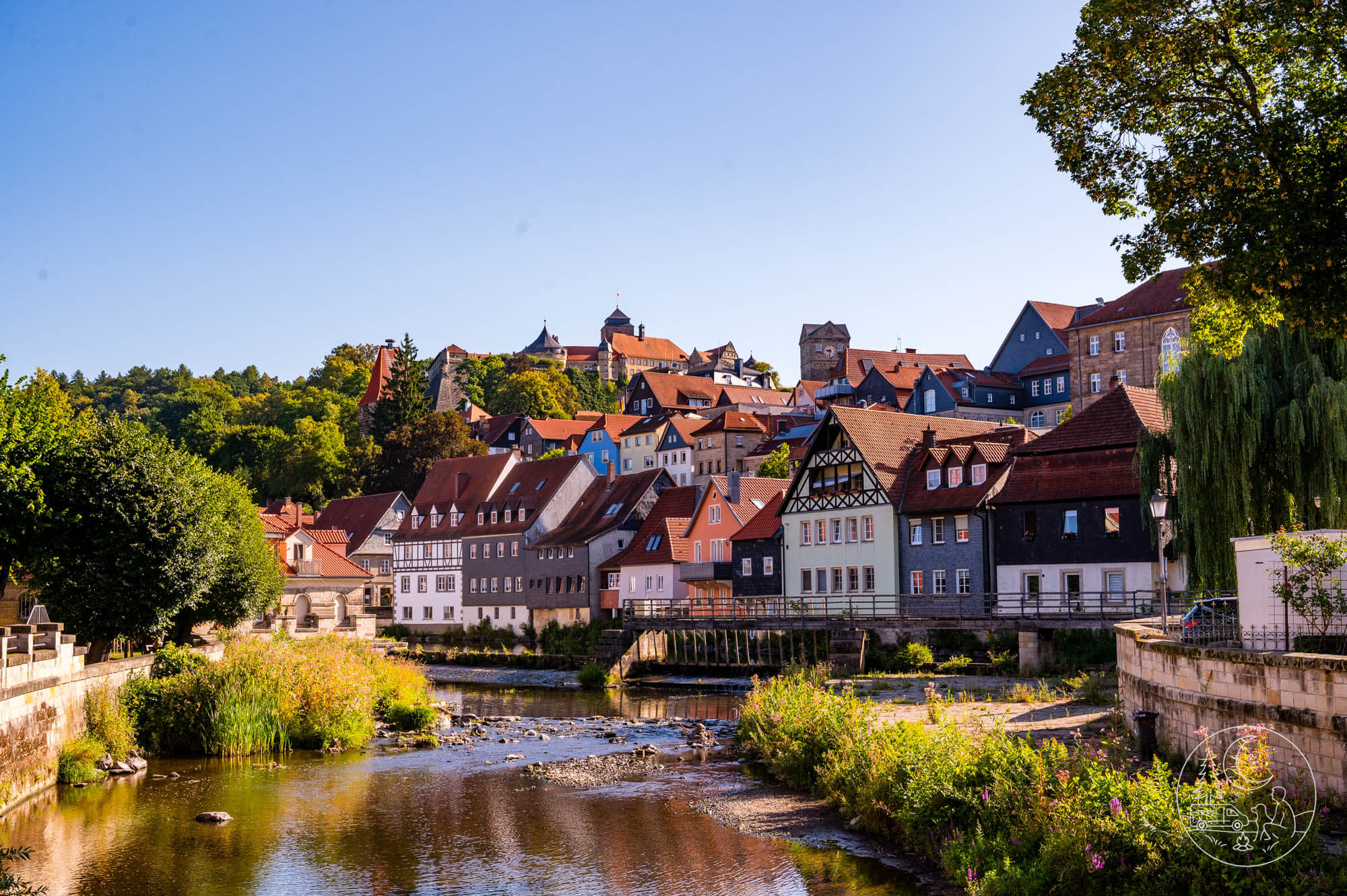 Unser Spaziergang durch Kronach beginnt am Fluss Haßlach, einem von drei Flüssen, die die Stadt durchziehen. Wir schlendern durch kleine Gassen, vorbei an alten Fassaden, und erreichen bald das Ufer. An der Jahnsallee finde ich schattige Bänke, von denen aus sich die Skyline der Stadt wunderbar betrachten lässt: unten die Unterstadt mit ihren engen Häusern, darüber die Oberstadt, und hoch oben thront die Festung Rosenberg. Maxi springt ins Gras am Ufer, schüttelt sich und legt sich zufrieden nieder. Ich atme tief ein und genieße diesen ruhigen Moment am Wasser.