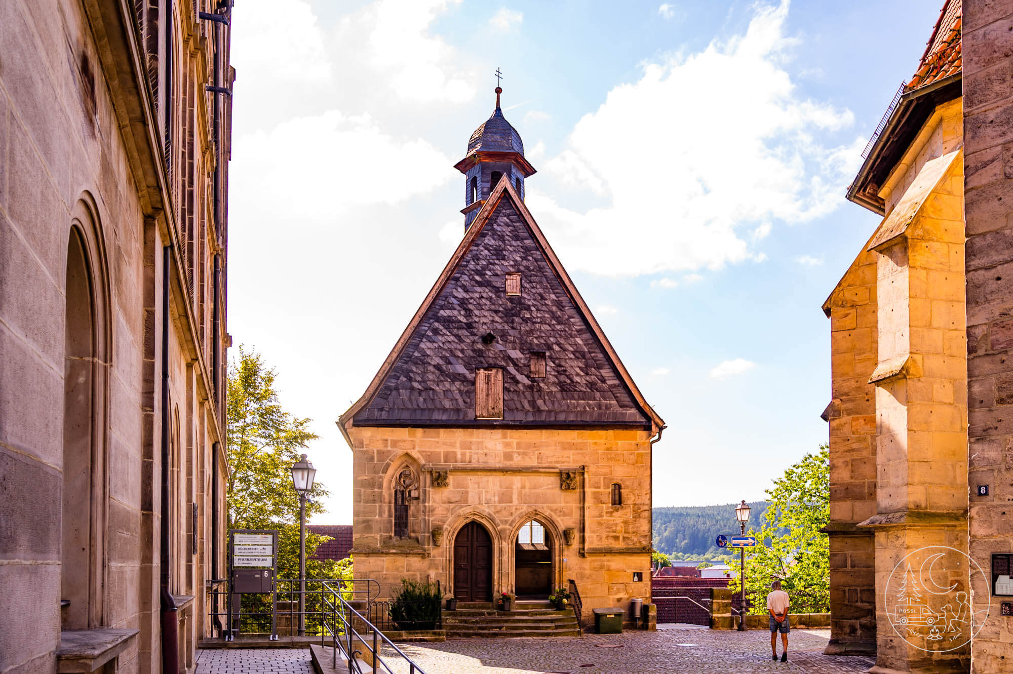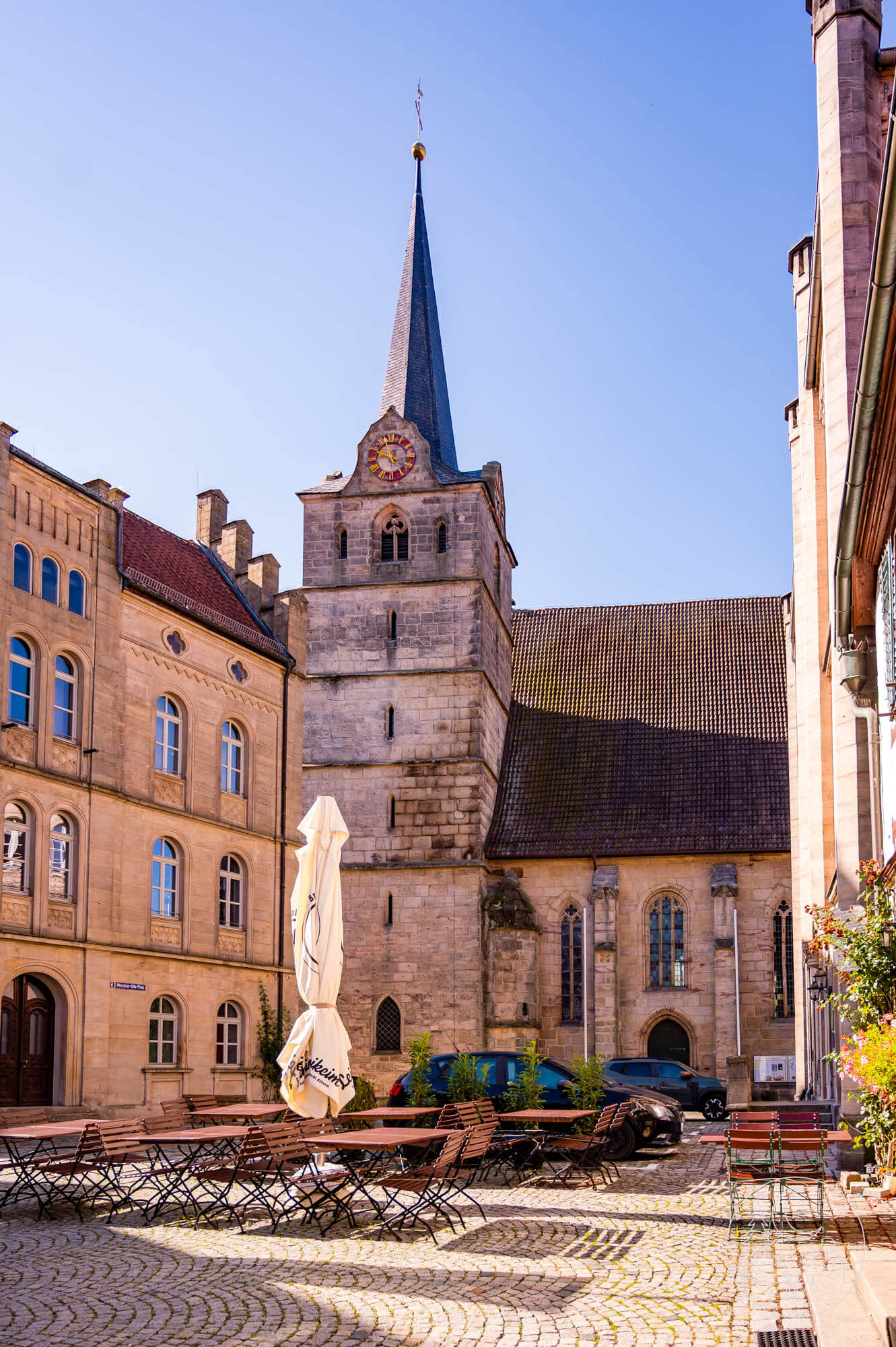 Am Melchior-Otto-Platz betrete ich das Herz der Oberstadt. Rechts erhebt sich die Pfarrkirche St. Johannes der Täufer, im 15. Jahrhundert als spätgotische Hallenkirche erbaut, schlicht, aber eindrucksvoll. Nebenan steht die kleine Annakapelle aus dem 15. Jahrhundert, ein Kleinod der Gotik mit Wandmalereien und schlichter Architektur. Dahinter öffnet sich der Blick auf die Unterstadt, ein herrliches Panorama aus roten Dächern und engen Gassen. Ich bleibe einen Moment stehen, genieße den Anblick und spüre die Mischung aus Andacht und Freude. Maxi legt sich neben mich und döst zufrieden in der Morgensonne.