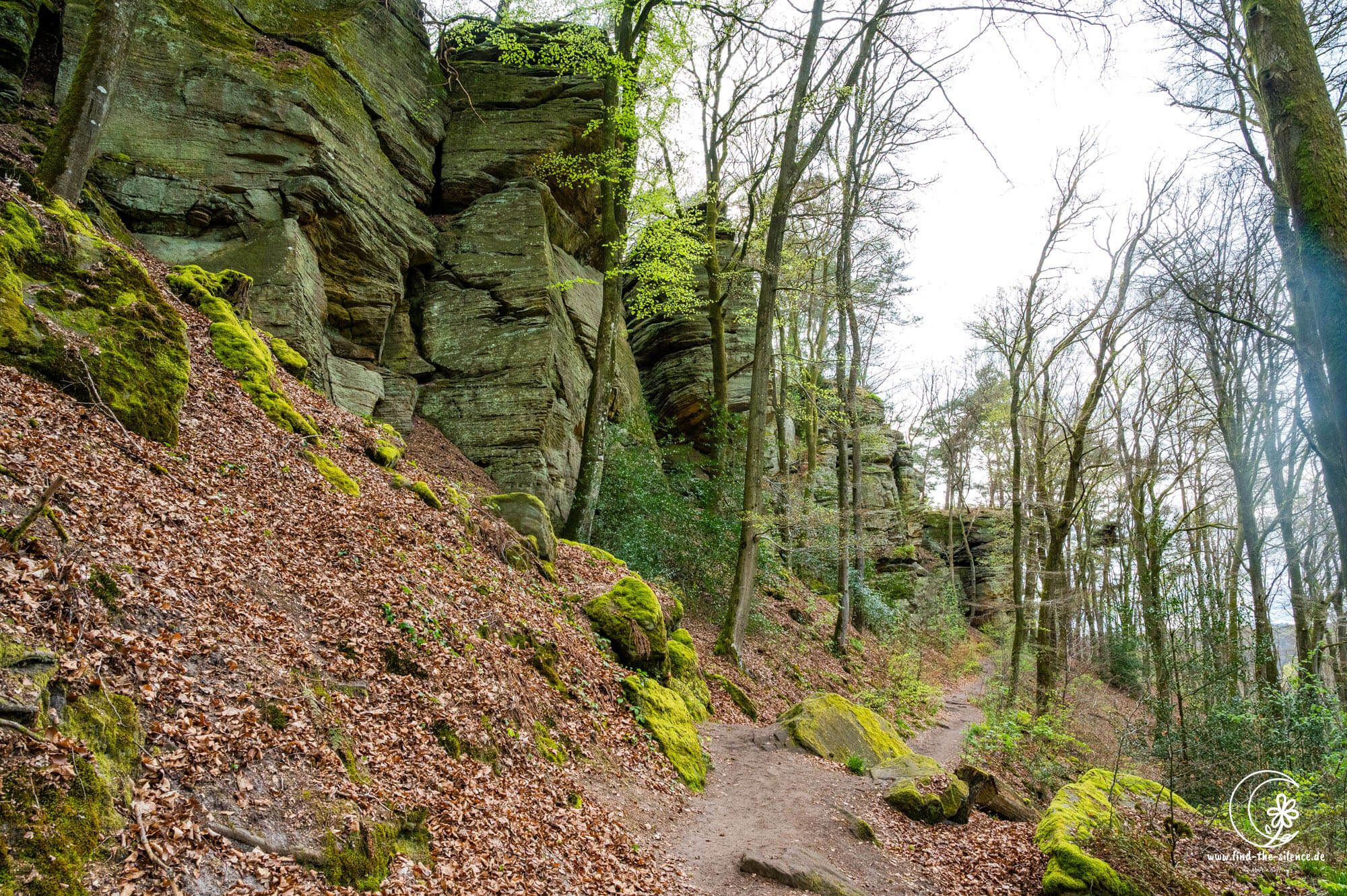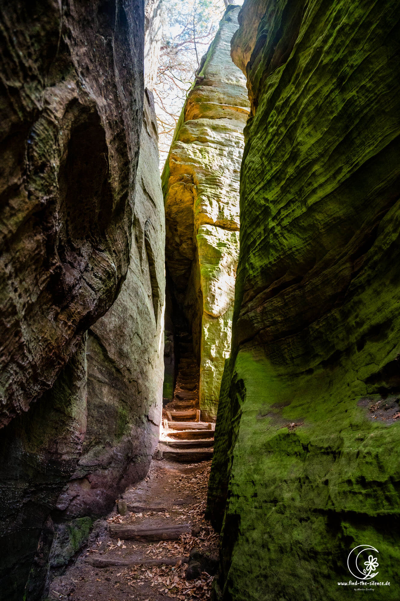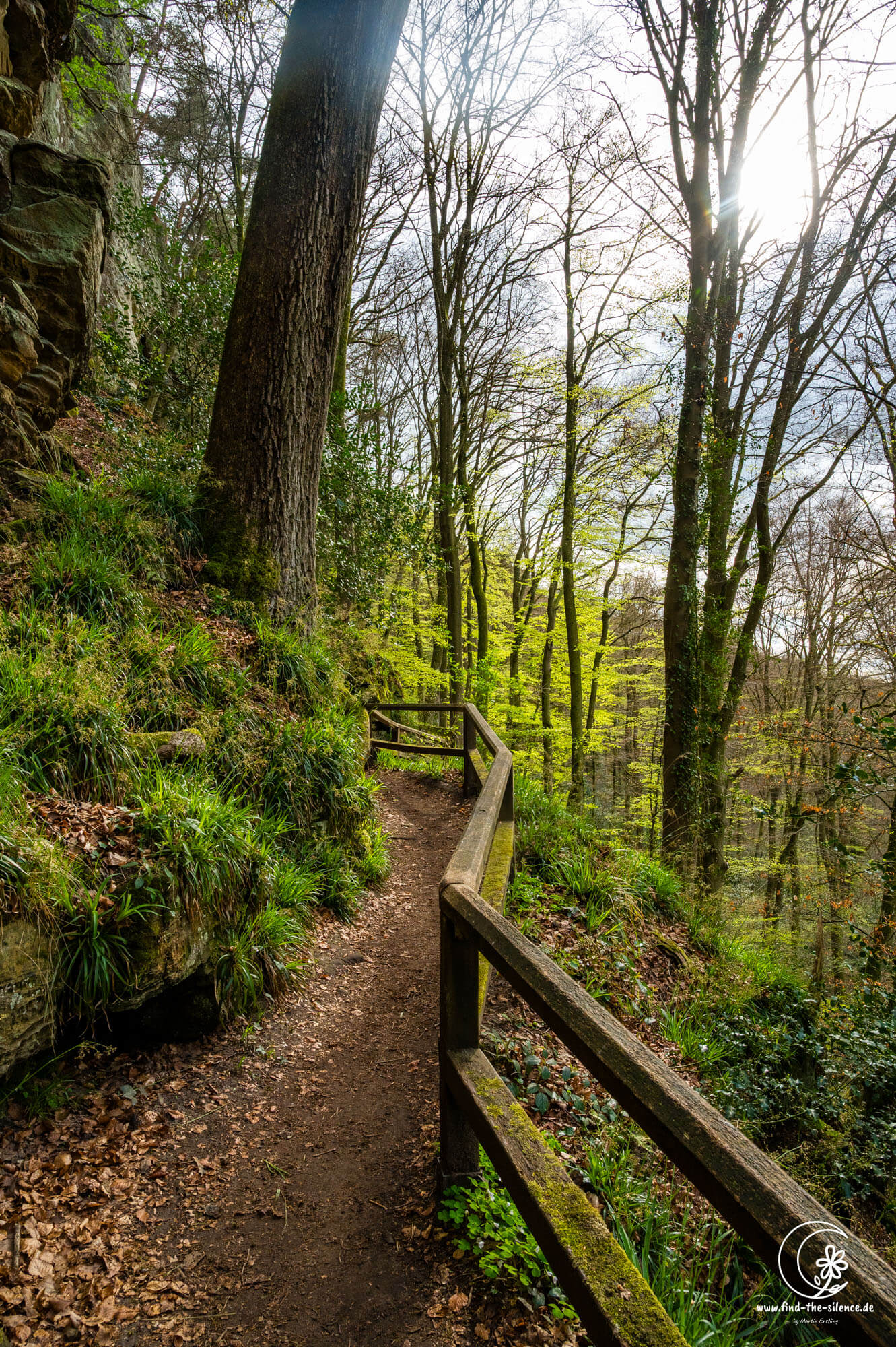 Nach einer Weile erreichten Maxi und ich den Aussichtspunkt Berdorfer Casselt, einen markanten Felsen mit einem erhöhten Aussichtsplateau. Eine einladende Bank lud zur kurzen Rast ein, während wir den ersten schönen Blick über das weite Tal genossen. Von diesem Punkt an änderte sich der Charakter des Tourentipp B2 merklich und es begann ein beeindruckendes Auf und Ab entlang der imposanten Felswände, die das Markenzeichen der Kleinen Luxemburger Schweiz sind. Einige Stufen führten uns hinab, und wir befanden uns nun direkt unterhalb der gewaltigen Gesteinsformationen.