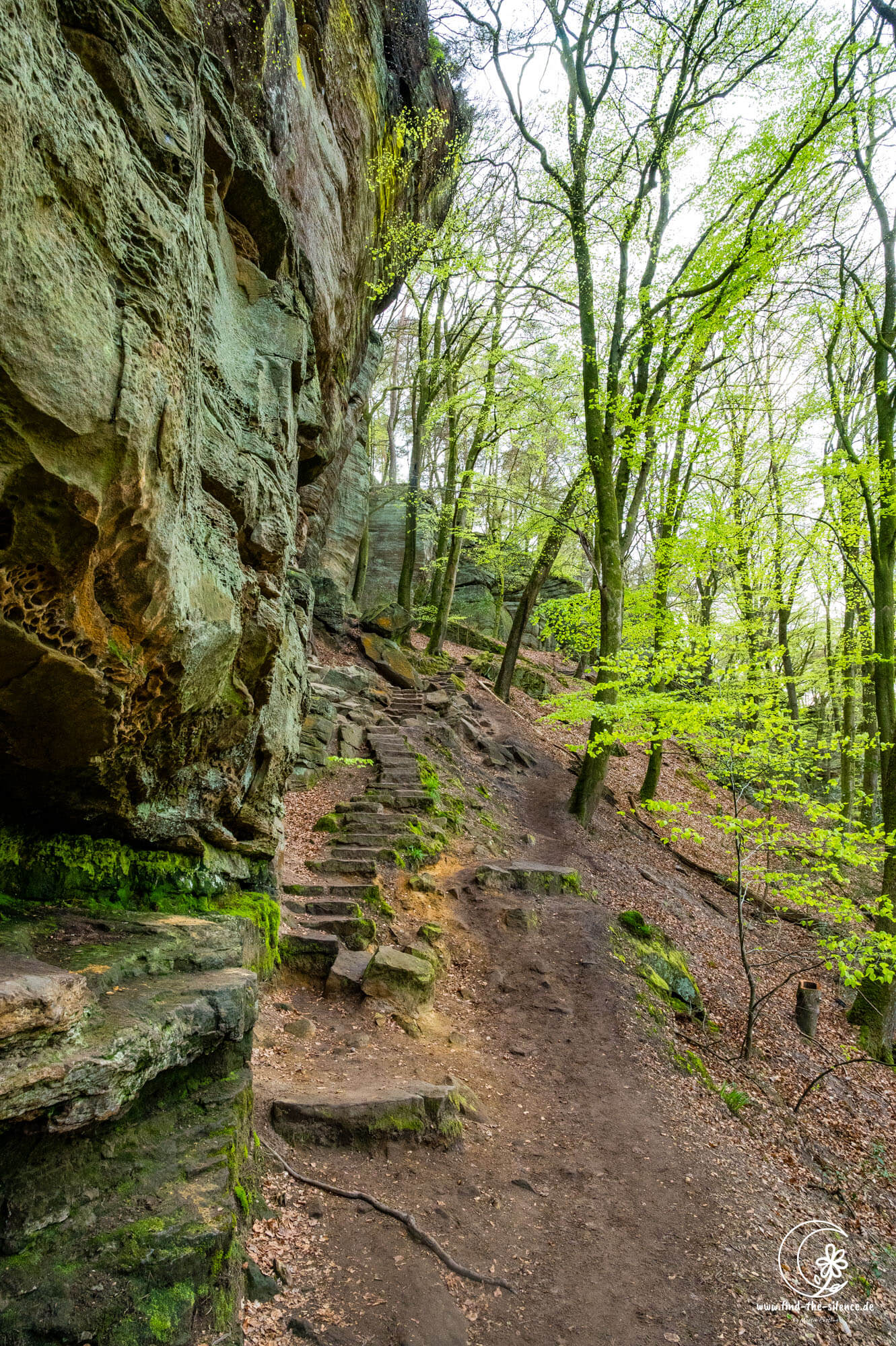Der erste Teil unseres Tourentipp B2 führte uns auf einem angenehmen und entspannten Waldweg durch den frühlingshaften Wald. Die Vögel zwitscherten fröhlich, die Umgebung präsentierte sich in ihrer vollen Pracht, und in den späten Nachmittagsstunden waren nur noch wenige andere Wanderer unterwegs. Immer wieder erhaschten wir einen ersten Blick auf die faszinierenden Felsen, die diese Region so besonders machen, doch zunächst genossen Maxi und ich die sanfte Wanderung durch das grüne Dickicht. Wir bogen schließlich ab und passierten einen kleinen Wanderparkplatz mit einem einladenden Grillplatz, bevor der Weg wieder tiefer in den Wald führte und wir spürten, dass die eigentlichen Highlights des Tourentipp B2 immer näher rückten.